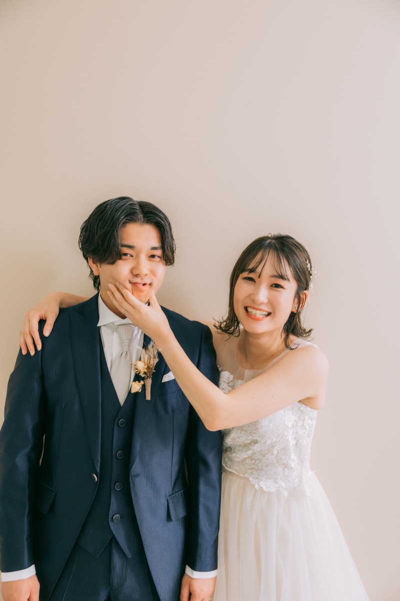 新婦さんが新郎さんのほっぺをギュッてしているおもしろショット!