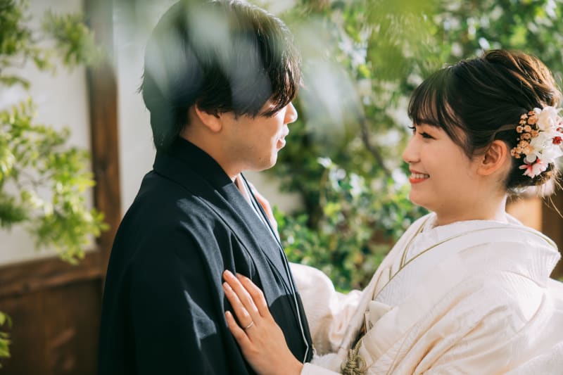 新婦さんは足を少し投げ出して座って新郎さんは後ろから優しく見つめてますね!