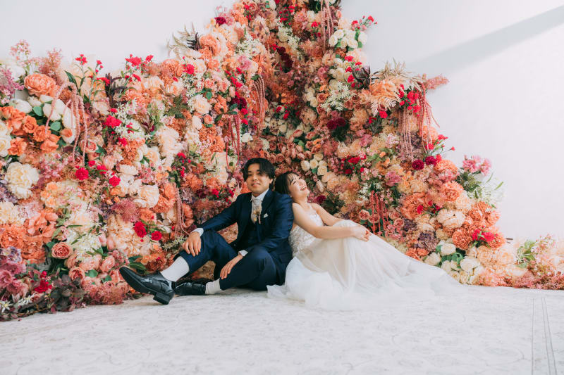 花壁の前で背中あわせで座ってもらいました!!
