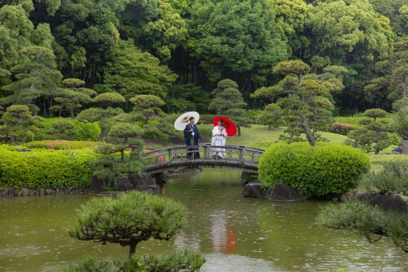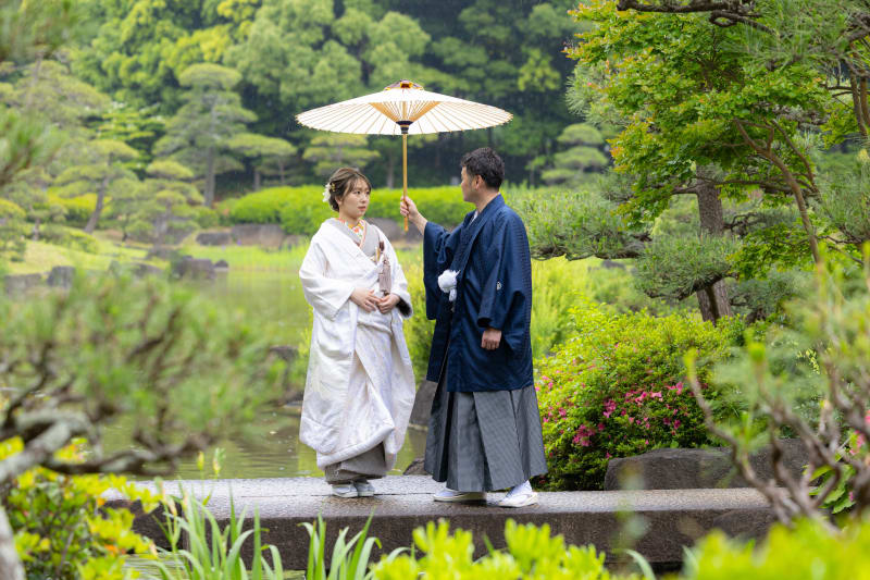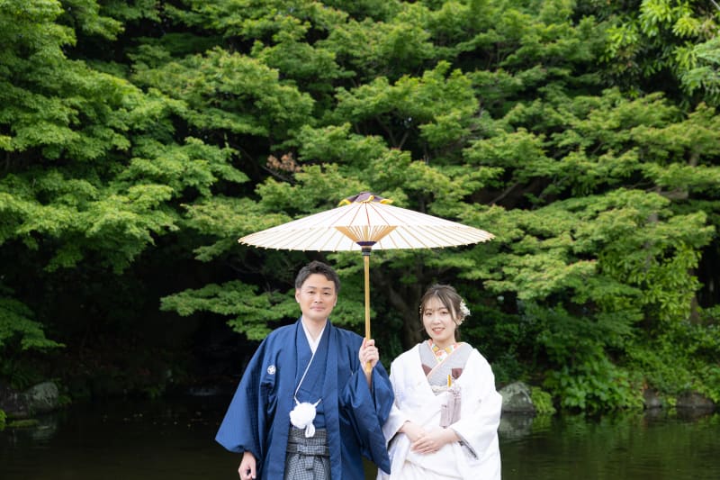 最初は新郎さんに白の番傘を持ってもらっての相合傘ショット!!