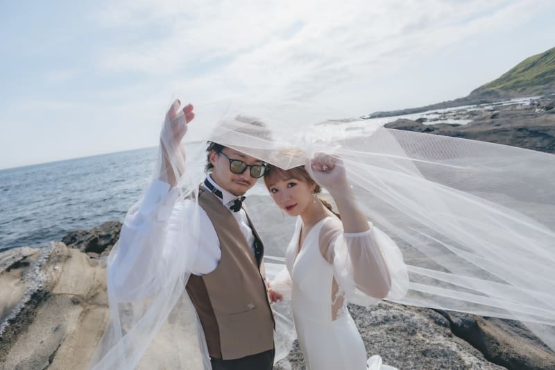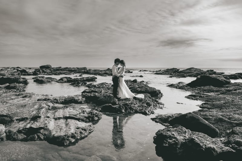 岩場では水面にお二人が映り込む反射写真も撮影可能!