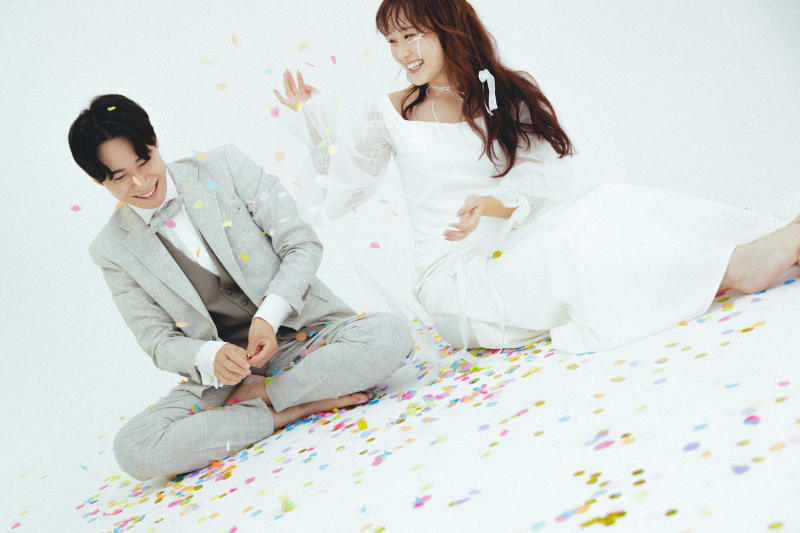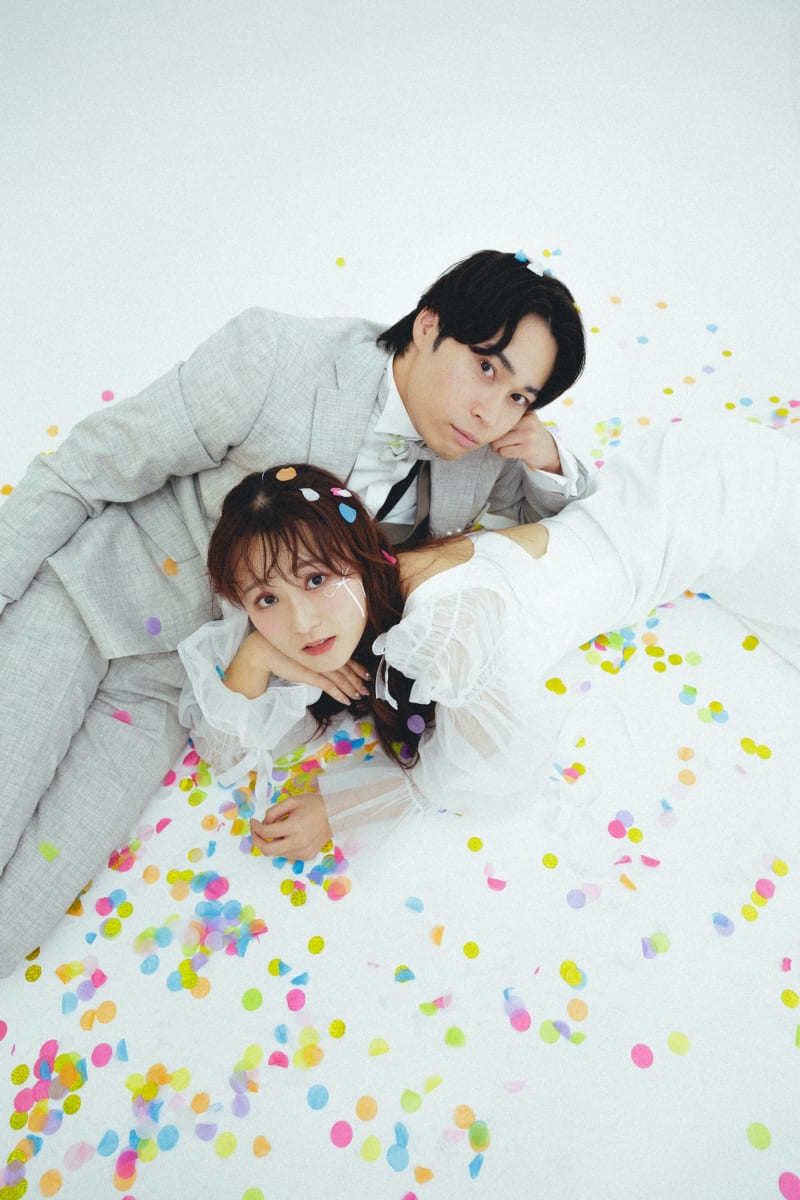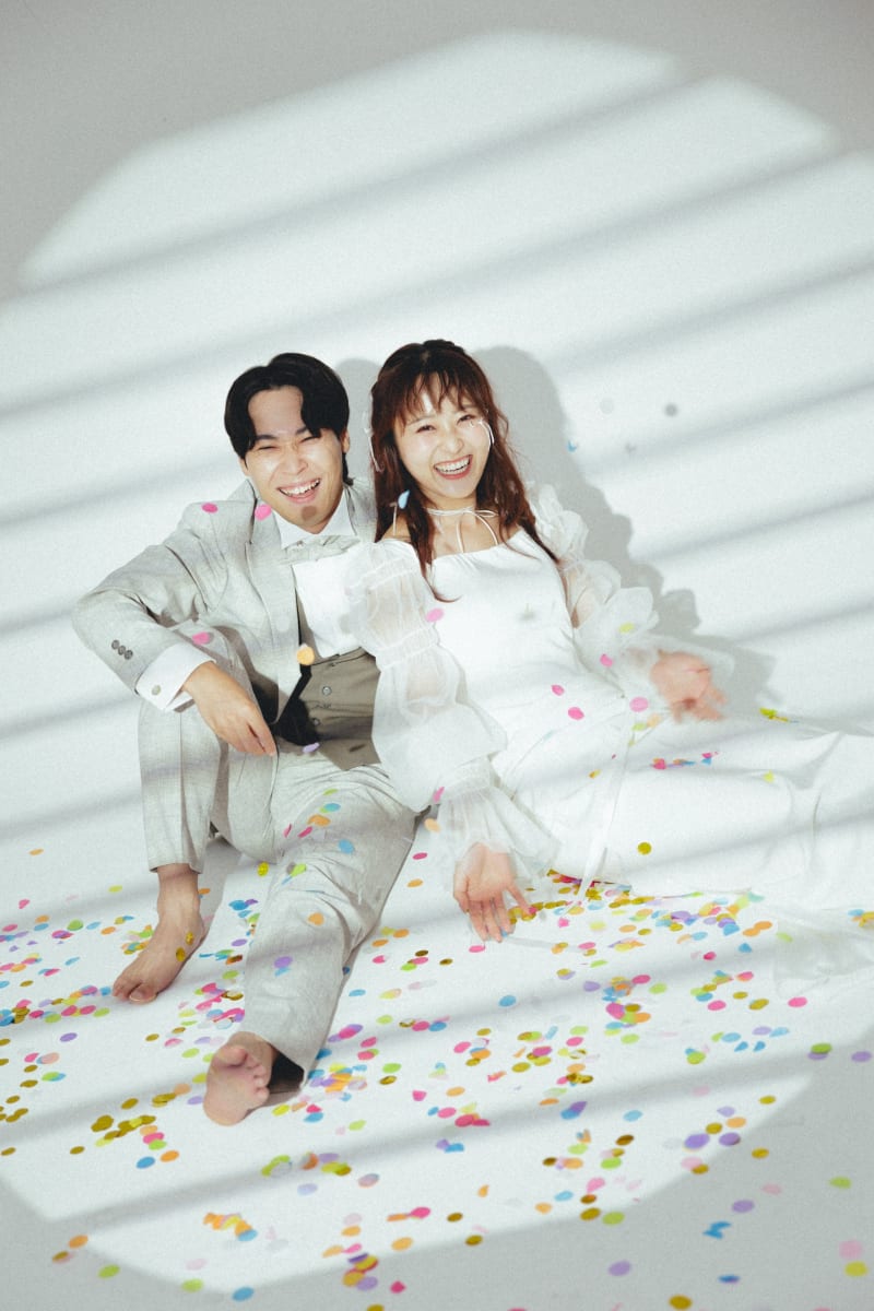 カラフルなコンフェッティの上に寝転んだカットも素敵です。