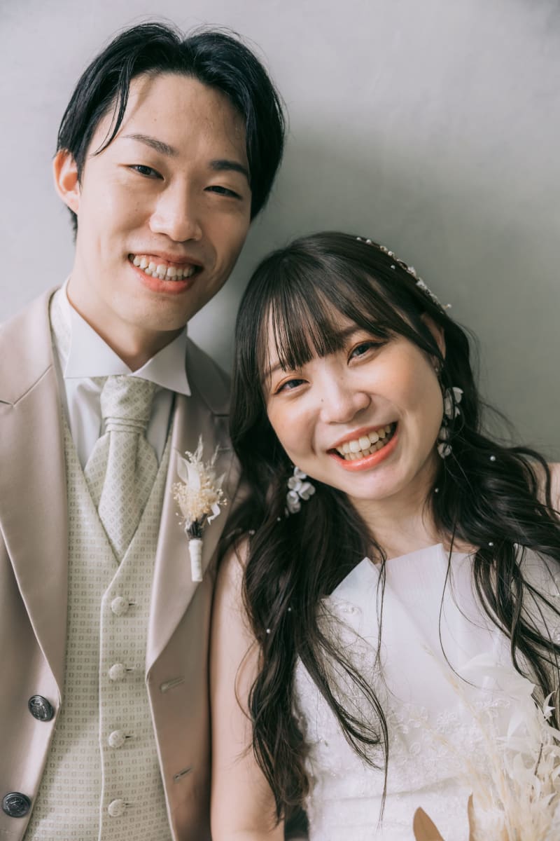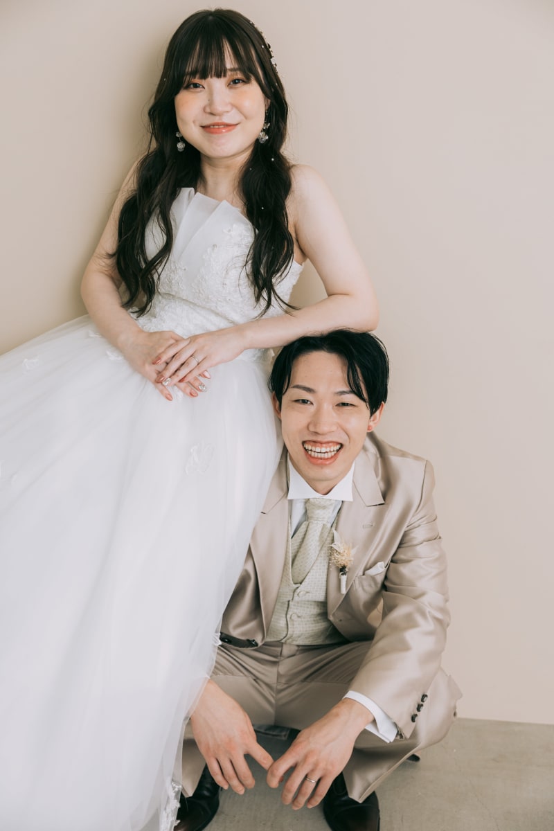 ベージュの壁で!ご新婦様が寄りかかっているようで微笑ましいです^^