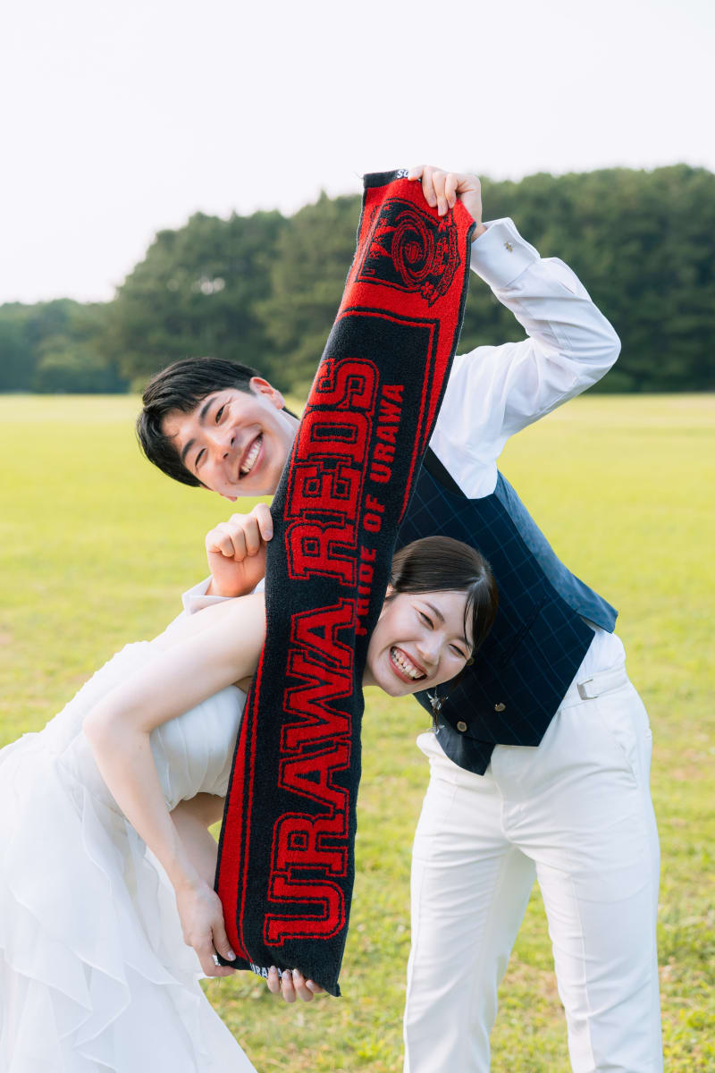 続いて!稲毛海浜公園へ移動してのお写真です!ご新婦様はウェディングドレスへ衣装チェンジ!サッカーチームのフラッグと!