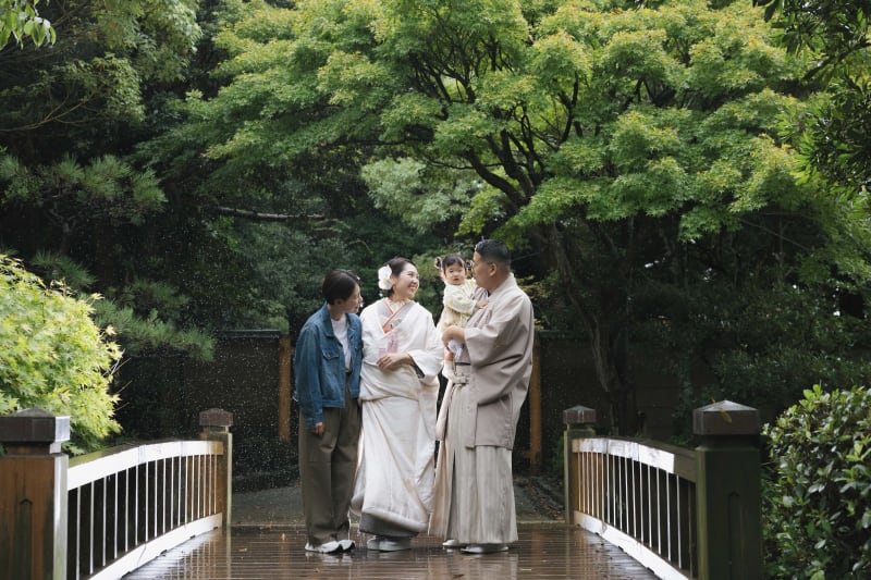 見浜園の美しい景観と、雨の日にしか見られない独特の風情。そんな中で撮影された一枚一枚は、新郎新婦様、そしてお子様とご家族の皆様にとって、一生の宝物になることでしょう。