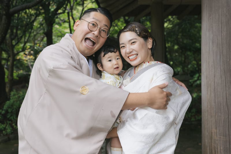 先日、見浜園にて特別なウェディングフォトの撮影を担当させていただきました。新郎新婦様は明るく、常に笑顔が絶えない素敵なご夫婦でした。そして、お二人のお子様もご一緒に参加され、にぎやかで和やかな撮影となりました。