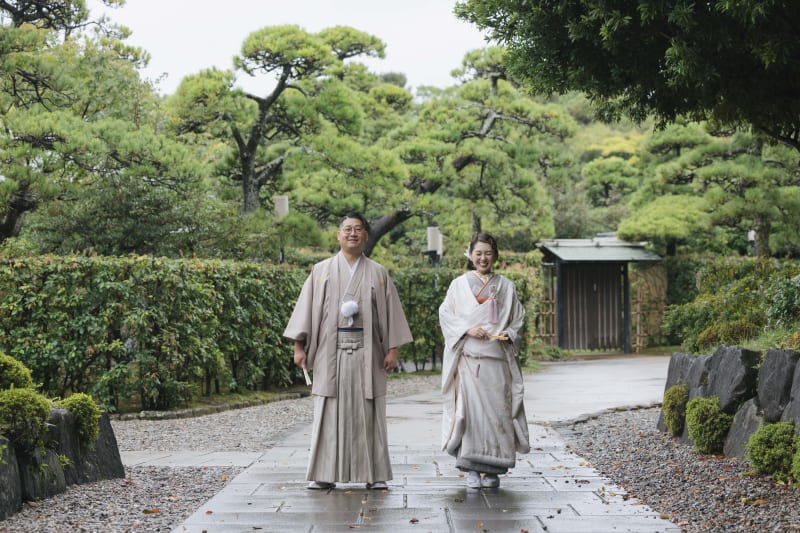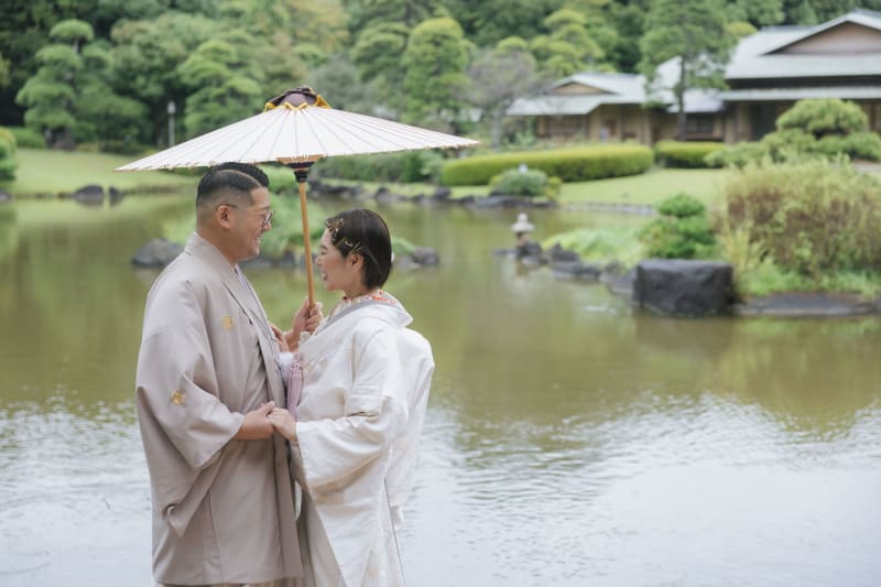 この日は小雨模様でしたが、雨は庭園をしっとりとした美しさで包み込み、和傘と白無垢姿の新婦様をより一層引き立ててくれました。天候を活かした撮影は、自然と二人の愛情深い表情を引き出す特別な機会ともなり、仕上がった写真には雨の日ならではの情緒が漂っています。