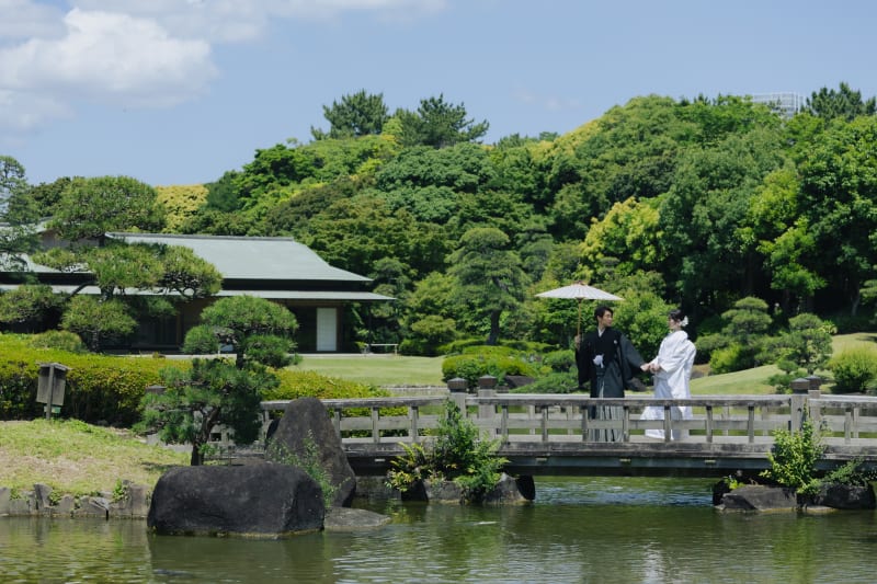 常緑樹が多く、橋や東屋とフォトスポットもたくさん◎