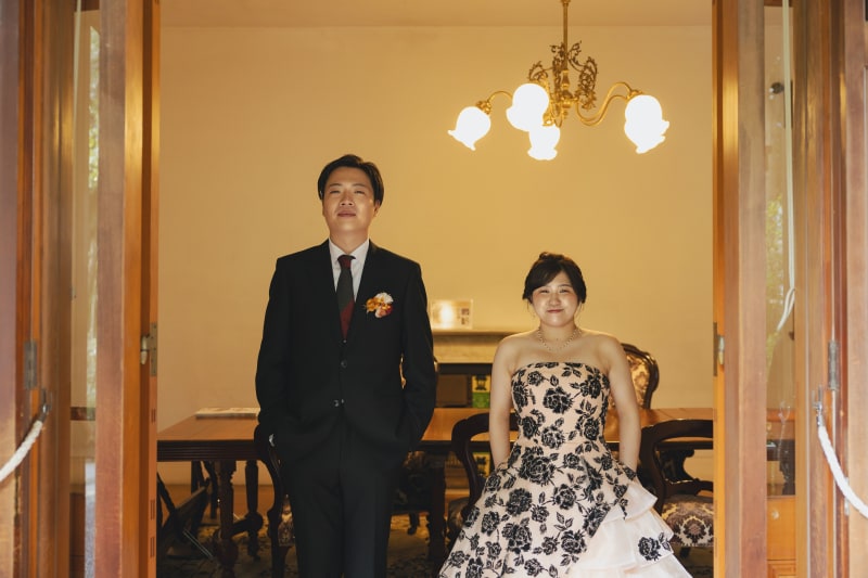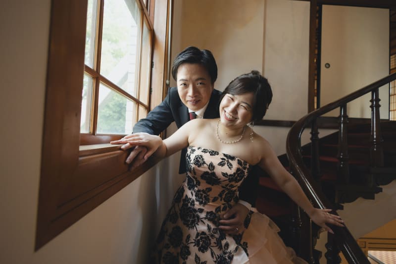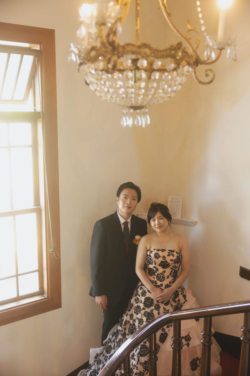 続いては、ドレスとタキシードの持ち込み衣装にチェンジ。シャンデリアが華麗に輝く洋館でのお写真は、旧神谷伝兵衛稲毛別荘ならではの贅沢なシーンに。