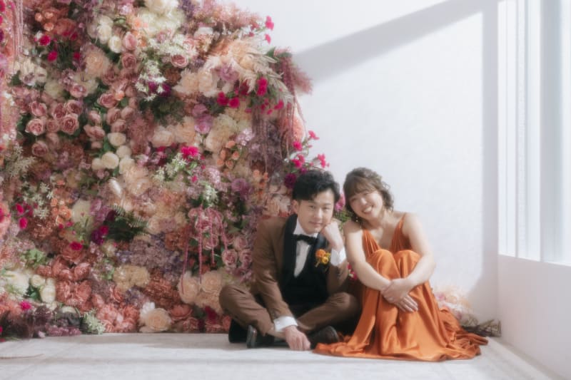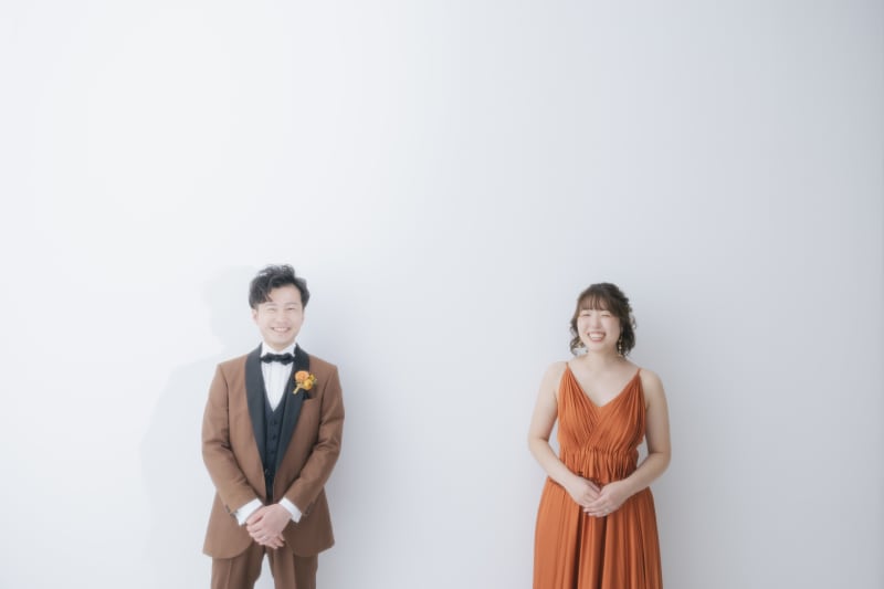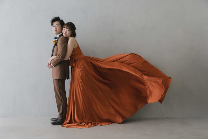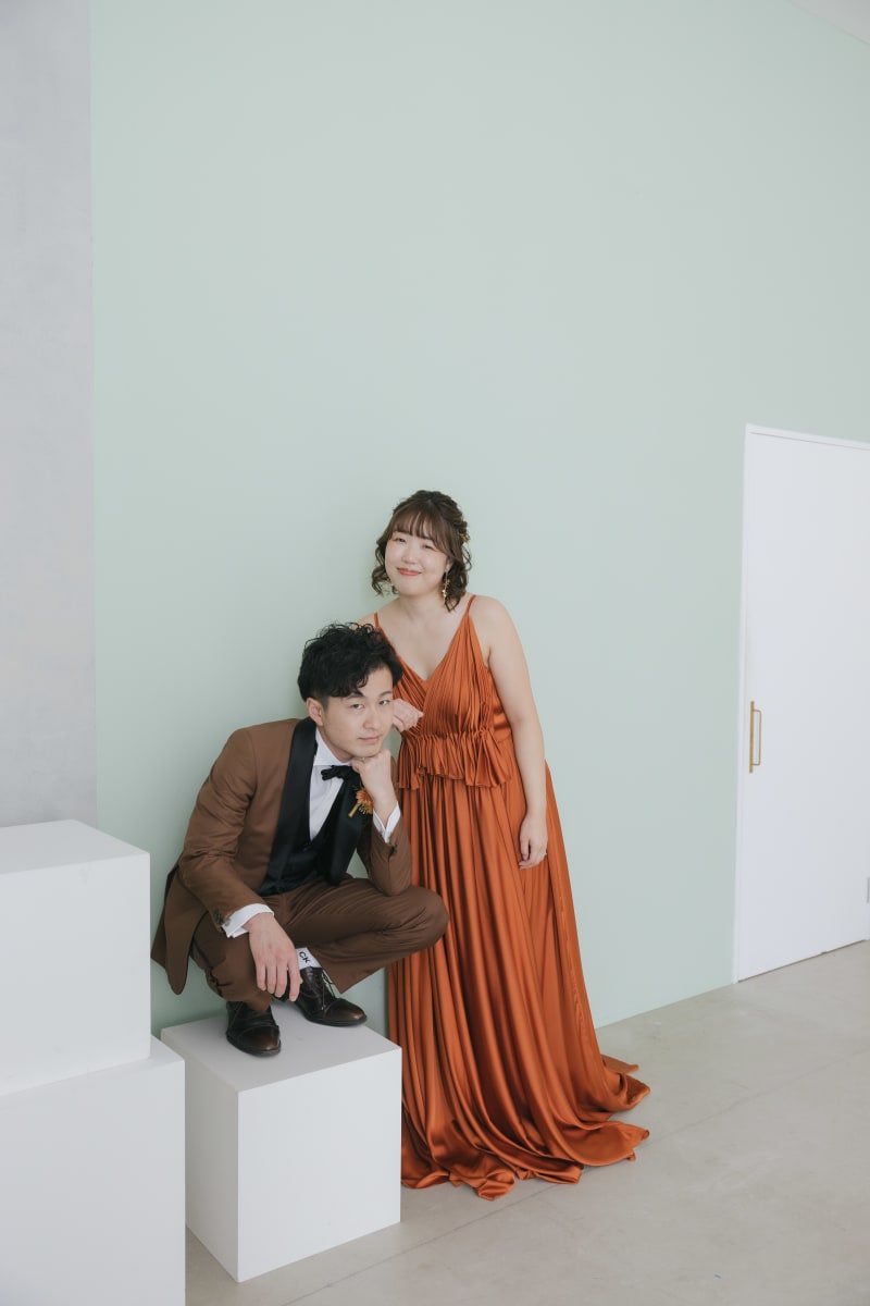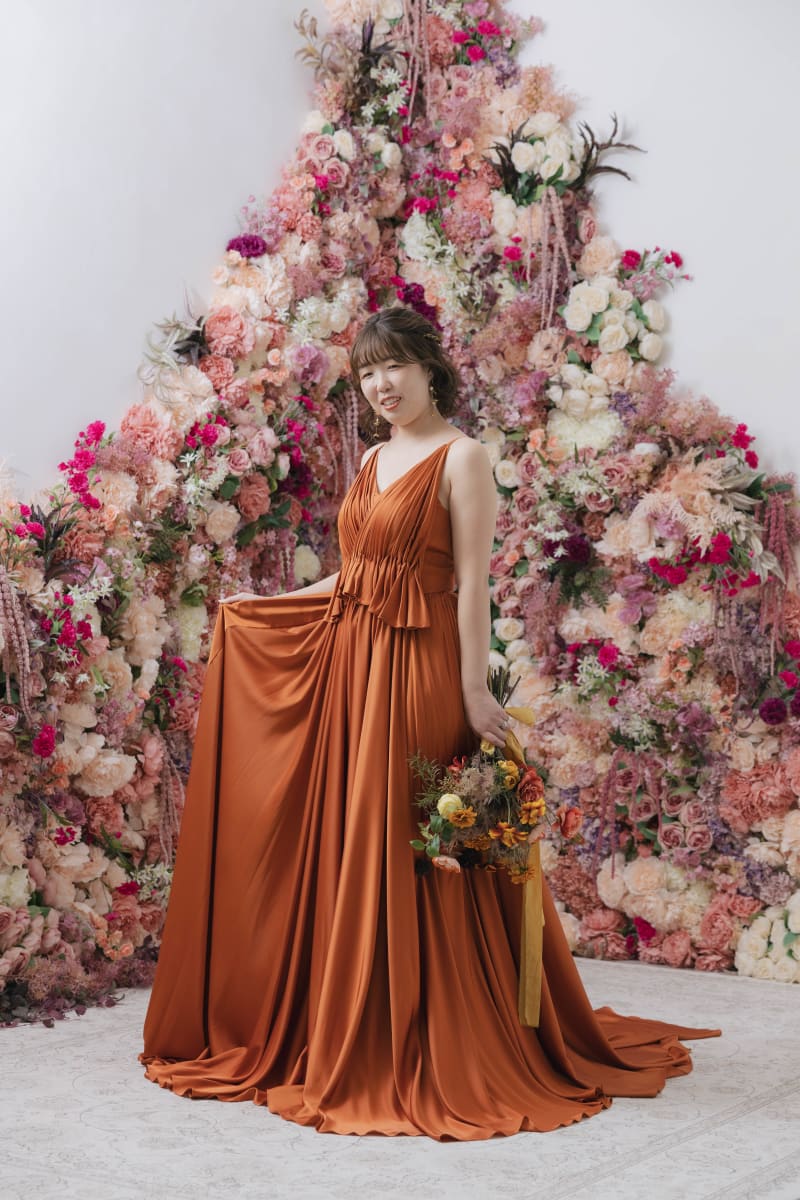 スタジオでは、テラコッタのドレスに身を包んだ新婦様の洋装撮影も行い、その華やかさにまた別の驚きを感じました。