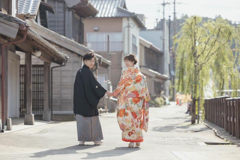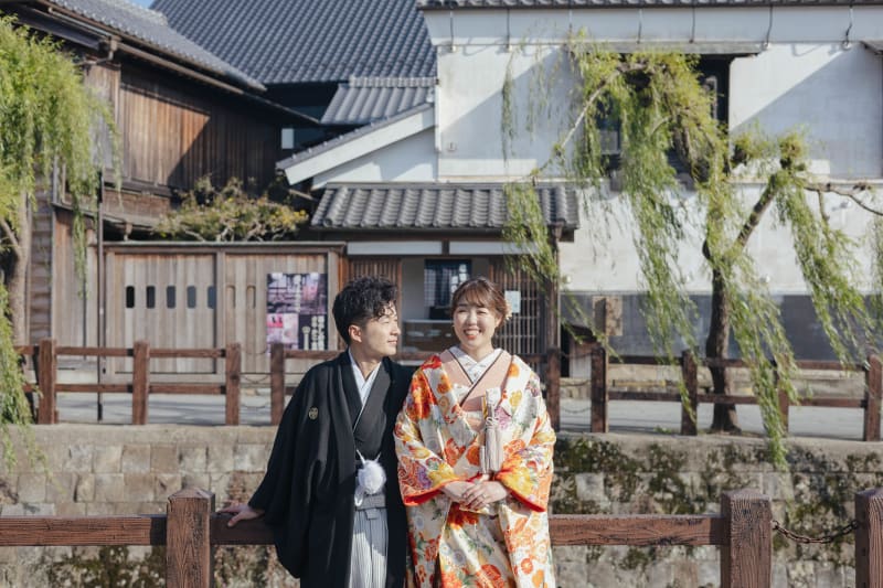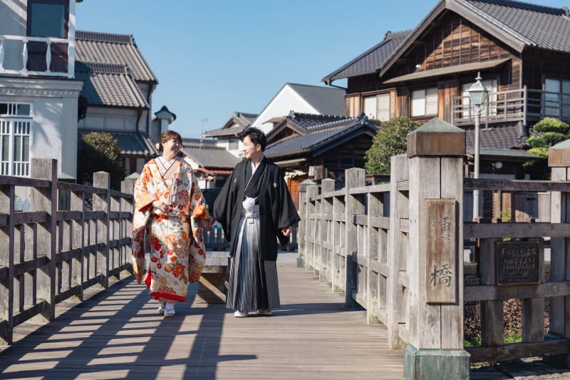 新婦様のこだわりの色打掛コーディネートは、佐原の美しい街並みにぴったりとマッチしていました。