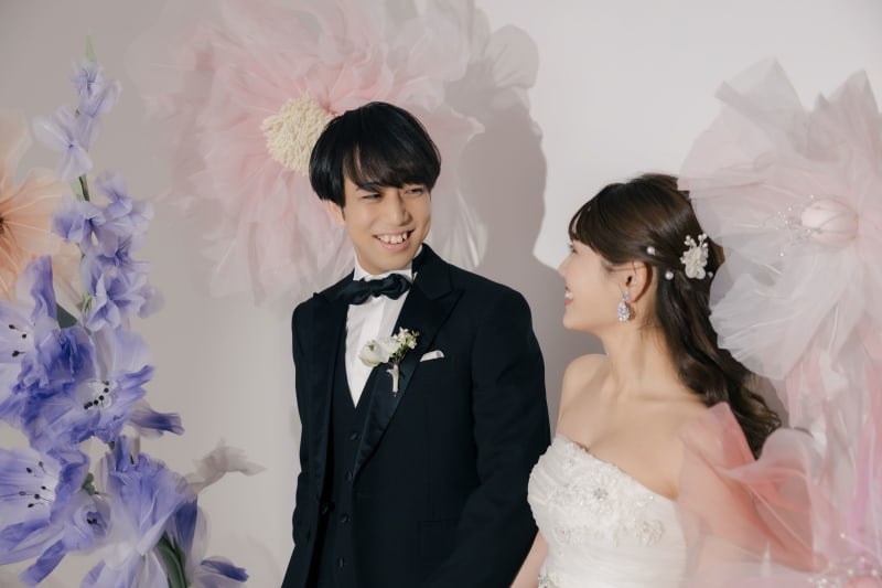 遠近法を使うことでおふたりがお花からひょっこり出てきているような