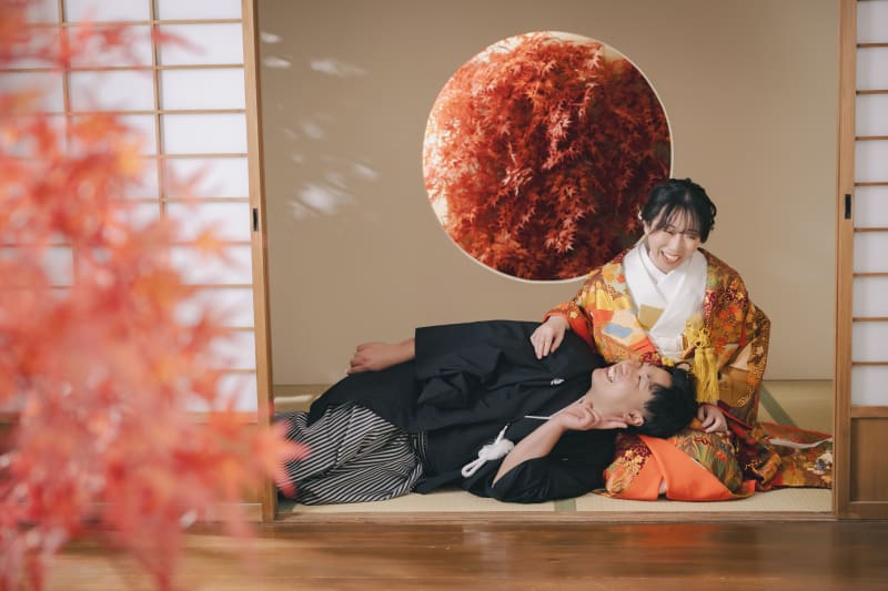 その後、屋内庭園スタジオへ移動し、和装での撮影を行いました。スタジオのシックな雰囲気の中でも、お二人は相変わらず明るく、ムードメーカーのような存在感を放っていました。