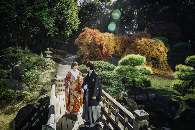新郎新婦のお二人が、最高の晴れ夫婦で見事な晴天!青空と紅葉のコントラストが美しいですね♪