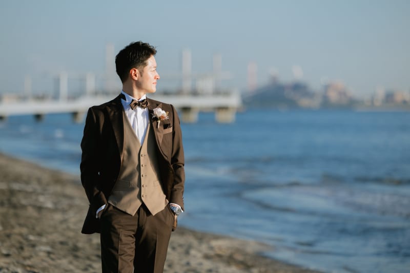 ご新郎様は海を歩いている様子を!遠くを見つめている表情がとっても良いですね◎