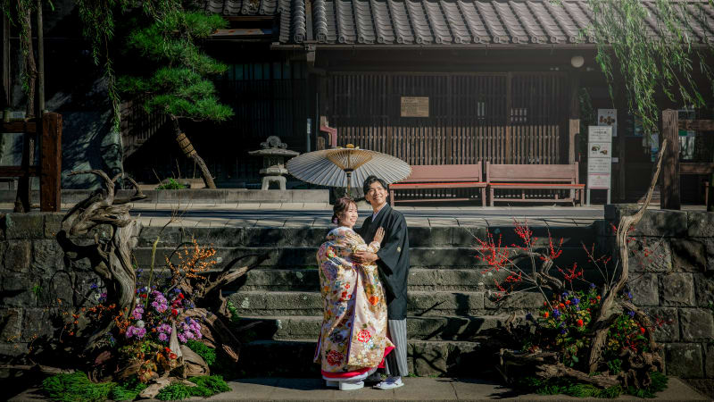 和傘を使っての撮影。江戸時代にタイムスリップしたかのようなお写真がとっても素敵です!
