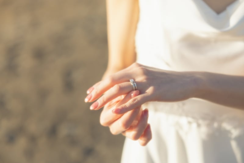 夕日に当てて指輪もキラキラに。手元の指輪ショットはあまり顔が目立つように撮れらるのは・・・という方にピッタリ!