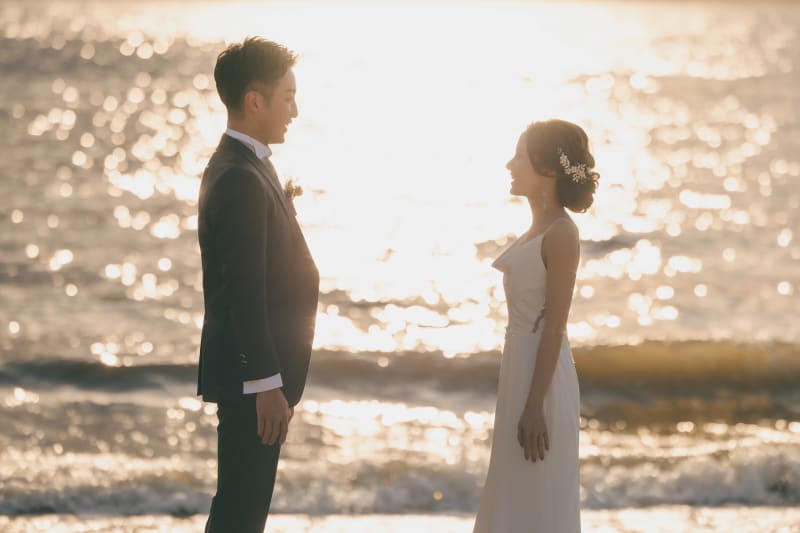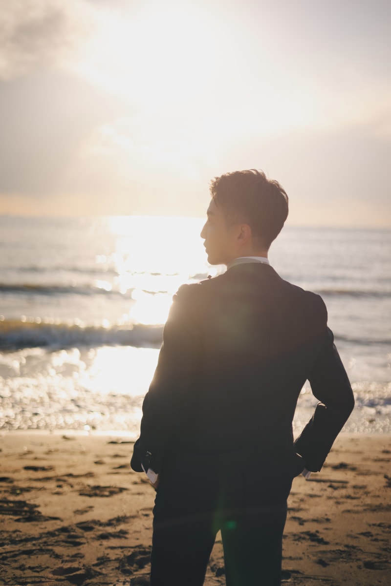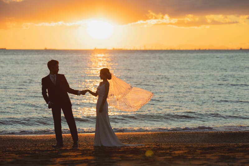 新郎様の広い背中をフィーチャー。こちらも夕日がいい味を出してくれてます!
