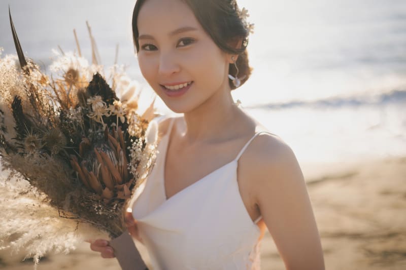 当店で用意しておりますドライフラワーのブーケを持って。自由に使用可能です!