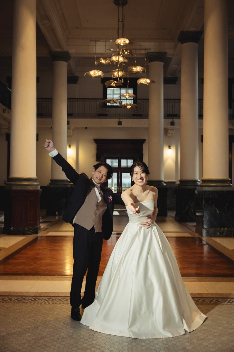 わかる人には分かる芸人さんのポージングで締め!お笑い好きの新婦さんに付き合ってあげる優しい新郎さんでした♩