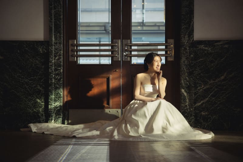 まずは後ろ姿から。窓から入る少しの光を使うとさや堂ホールの雰囲気と相まって落ち着いた綺麗な写真になるようにしました!