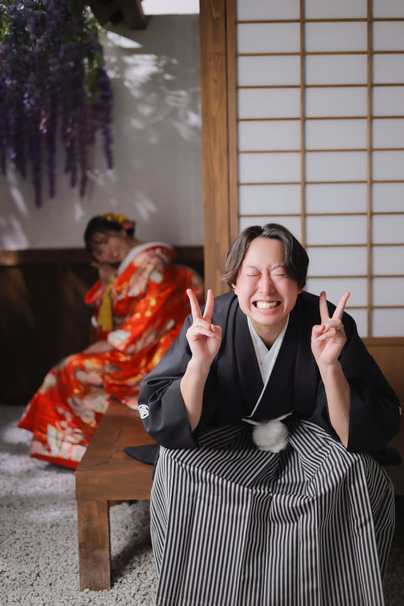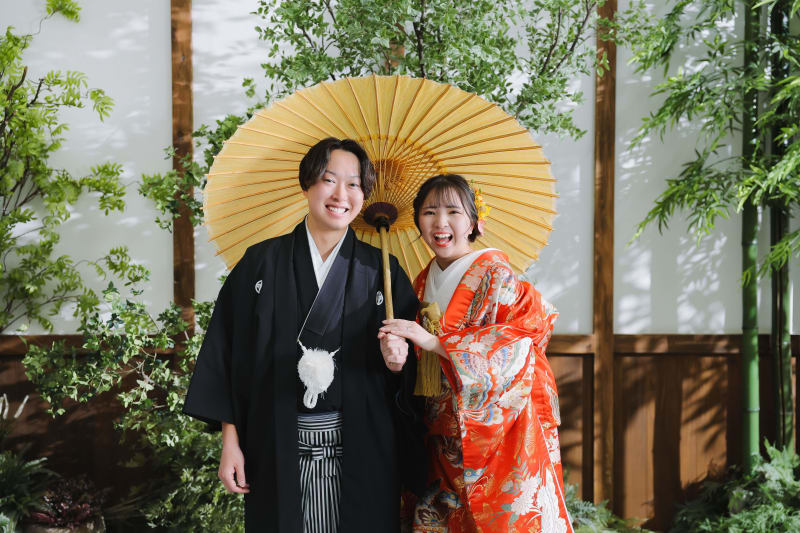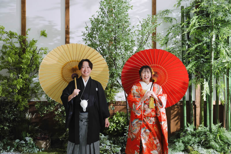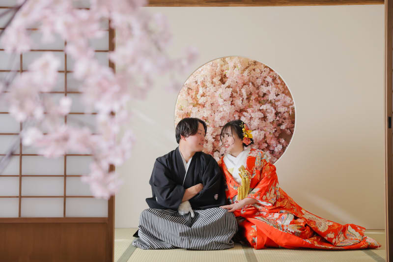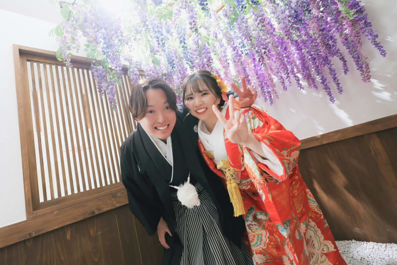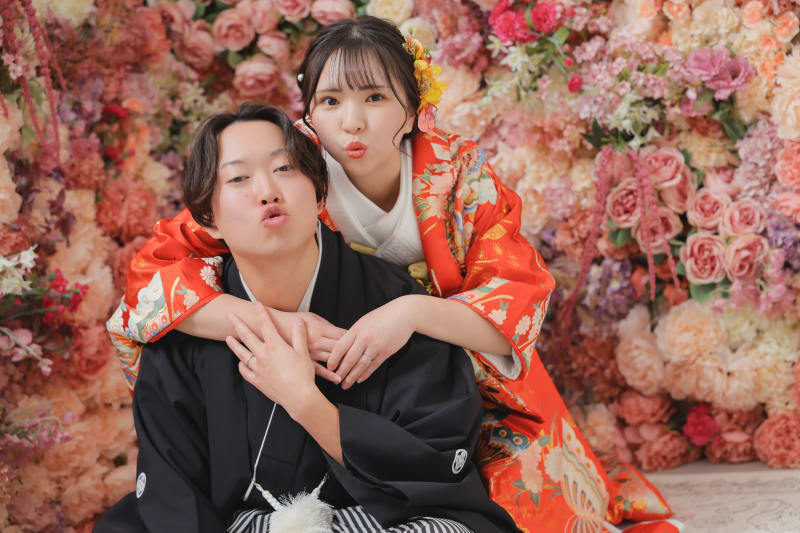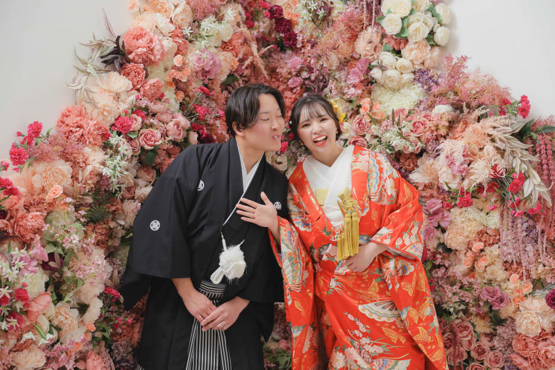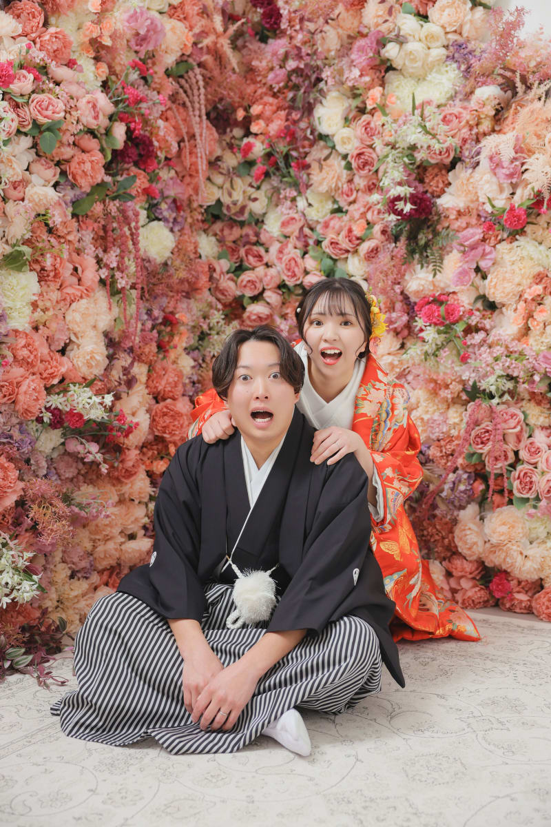 こんにちは!スタジオアクア千葉船橋店です! 和装で屋内庭園とハウススタジオのお花の壁で撮影しました!とっても賑やかで楽しい新郎新婦様でしたのでご紹介します!