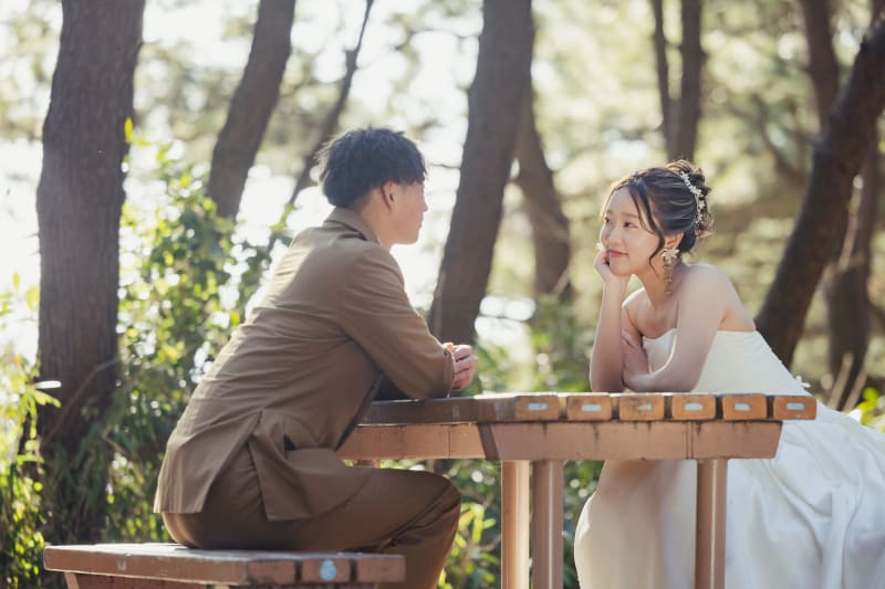 森の中にあるベンチでトークタイム中のお二人。この日は常にお日様が出てくれていたので緑でも綺麗でした!