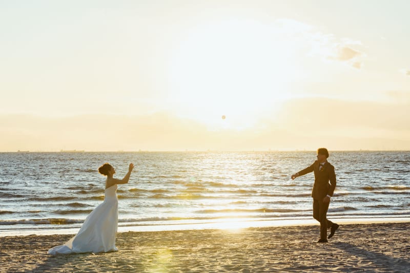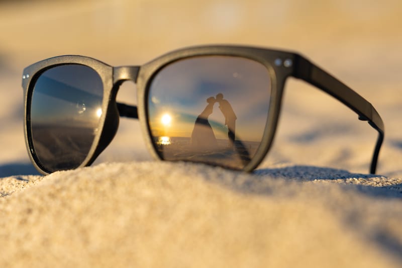 サングラスに映る夕日とお二人のシルエット。ドラマチックに仕上がりました!
