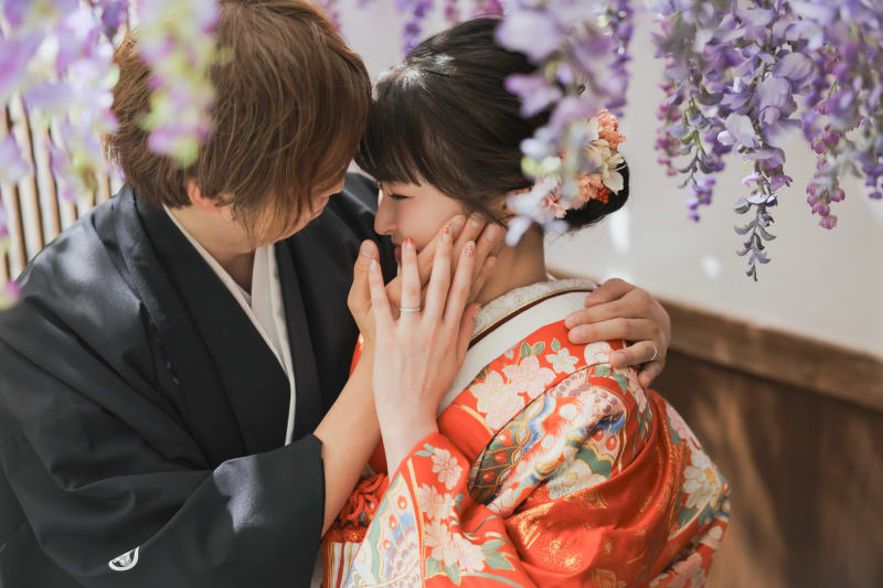藤の花の下での一枚。新婦様のネイルも可愛く仕上げてきてくださったのでしっかり撮影しました!