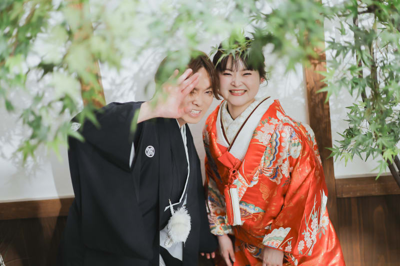 色打掛は赤をお選びいただきました。緑の背景で外で撮影しているかのように!