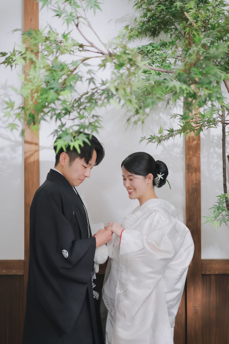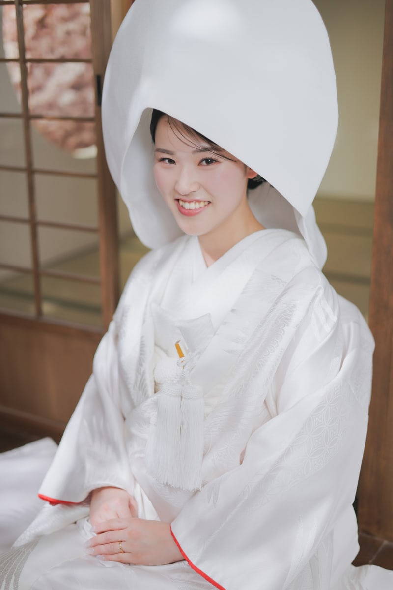 ここで新婦様綿帽子を被りました!綿帽子と衣装の白が新婦様の肌の透明感をより引き立てます!