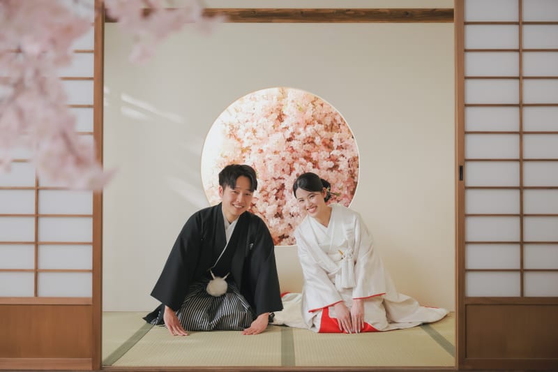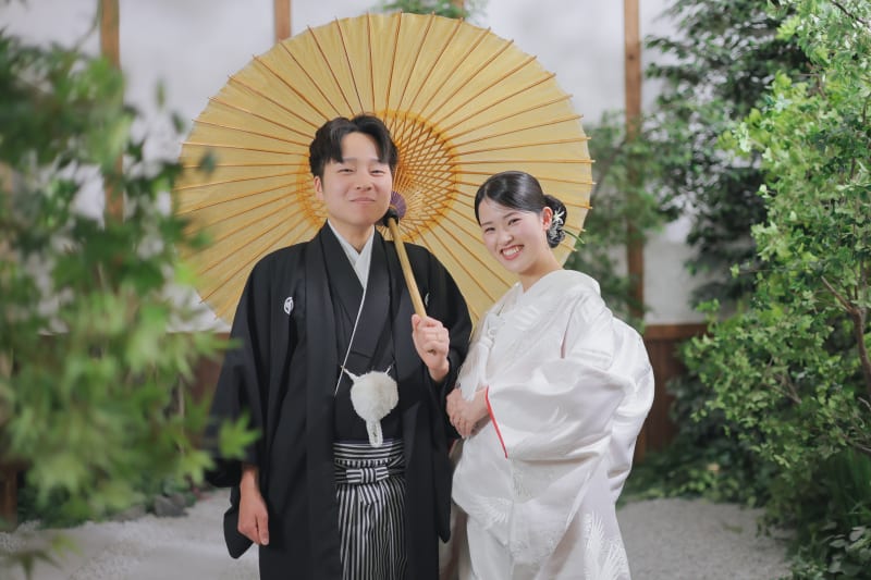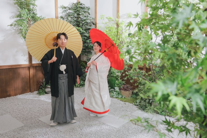 スタジオ全体を大きく使って撮影することもできます!新婦用、新郎用で和傘もこちらで用意しております!