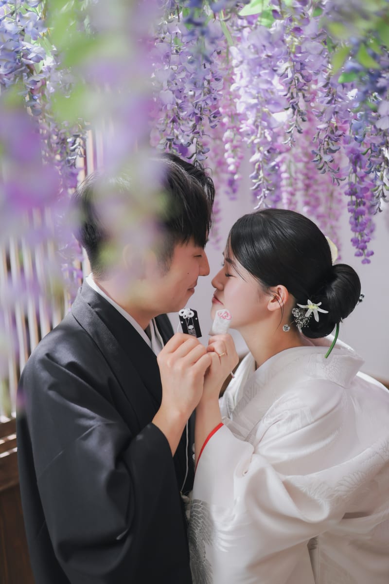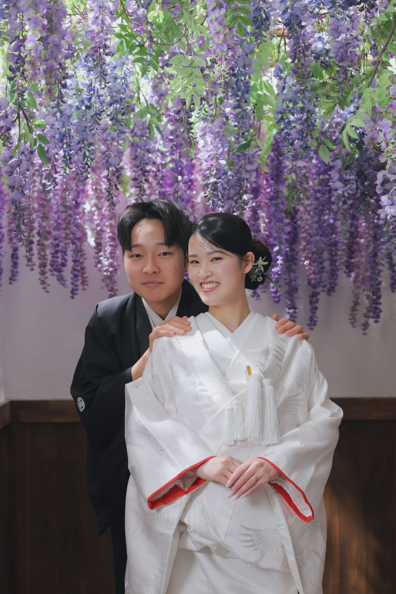 少し季節外れますが、一年中撮れる藤の花の下で。光が差し込む様子もこだわってます!