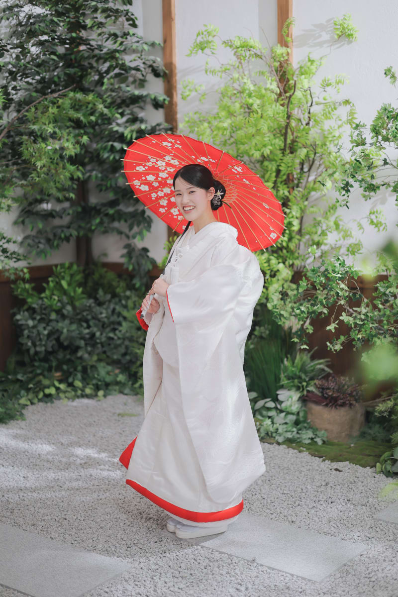新婦様用に小さい傘を使ってみました!白無垢に真っ赤な和傘が合いますね!