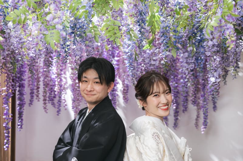 藤のお花の下でのお写真!色鮮やかなお花の色が映えますね!
