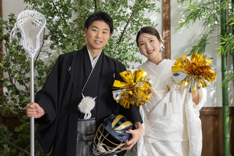 緑を背景に、お二人の思い出の部活の道具を持っての立ち姿のお写真!