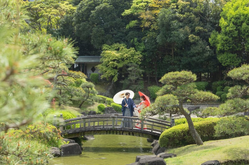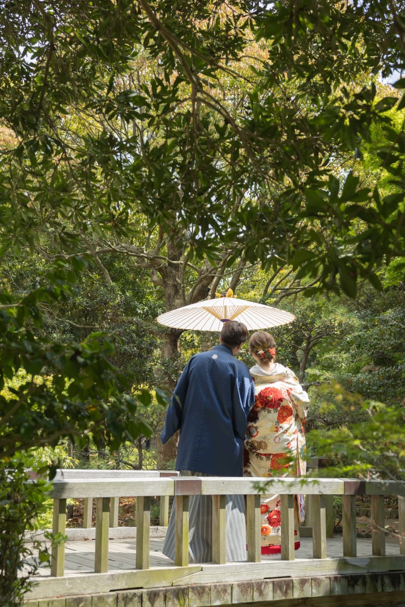 緑溢れる背景と太鼓橋とお二人ショット^^傘を持って散歩シーンです♩