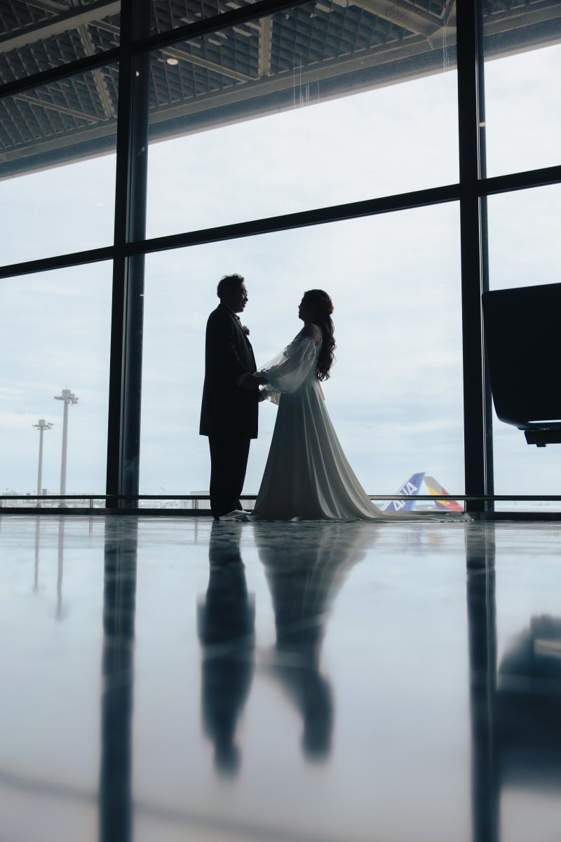 大きな窓の前で。外には飛行機が待機しております。床の写り込みも綺麗なのもポイント!