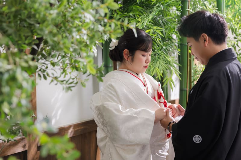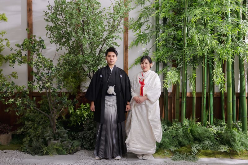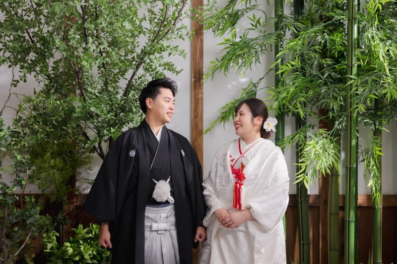 今回は屋内庭園スタジオで撮影されたおふたりのお写真のご紹介です! まずはこの緑の背景から!