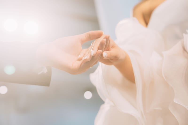 新郎さんに手を引かれているショットは光も相まってとても儚い雰囲気ですね。