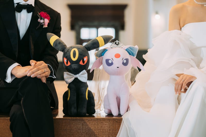 お二人に持ってきていただいた、ポケモンのブラッキーとエーフィのぬいぐるみに蝶ネクタイとベールを着けてウェディング仕様に!!本物の新郎新婦さんも一緒に並んでフォーショット。