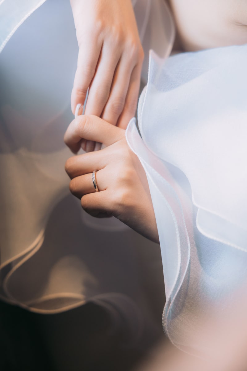 指輪のカットもドレスのデザインも相まって、まるで広告のように輝いて見えます!