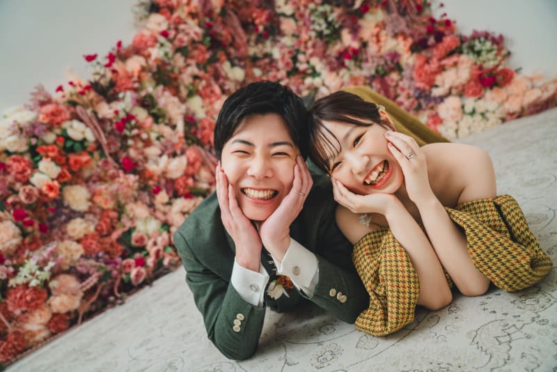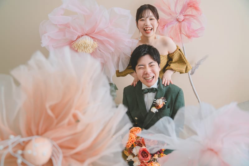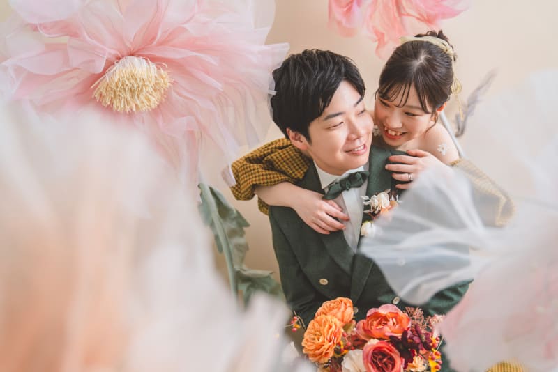 大きくてかわいいお花たちがおふたりを包み込んでとてもキュートな一枚です♡