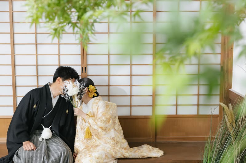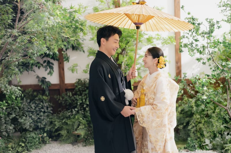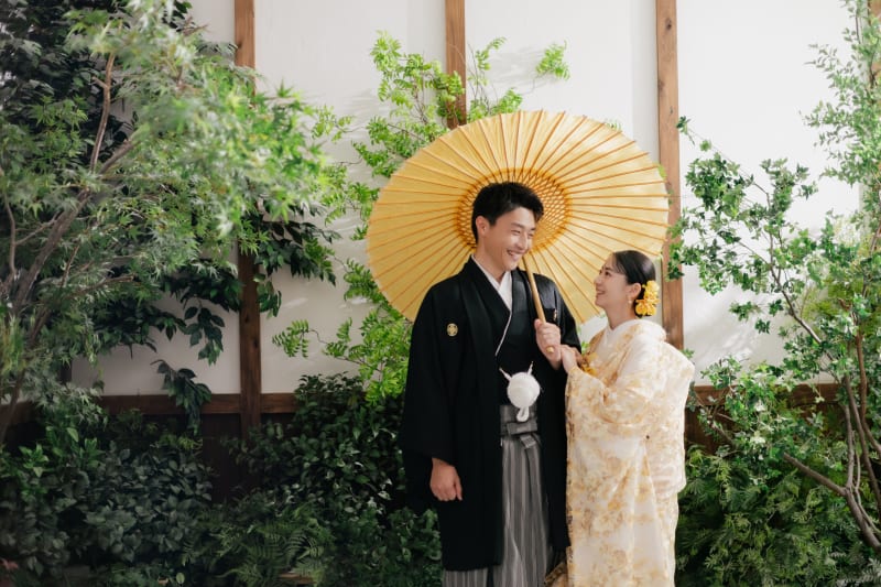 仲睦まじくお話中のお二人。こちらで用意しております和傘がいいアクセントになります!