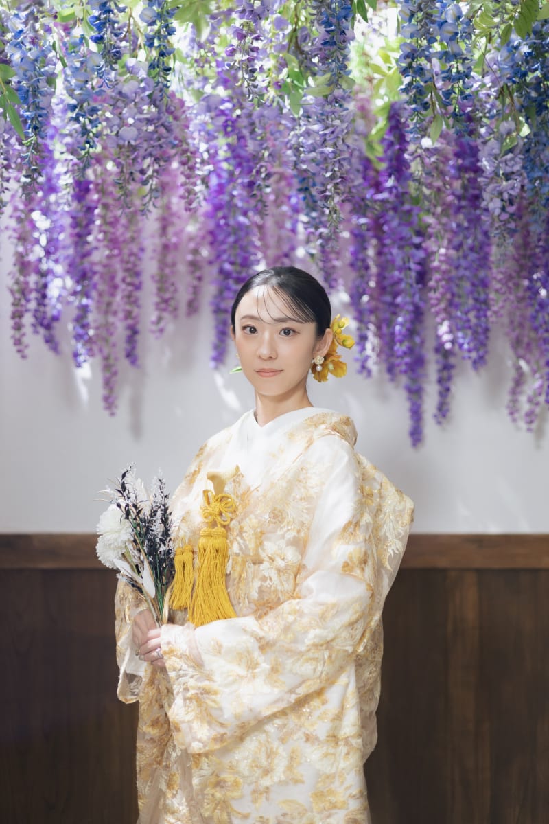 本物のように見える藤棚でソロショット。可愛いブーケも一緒に!