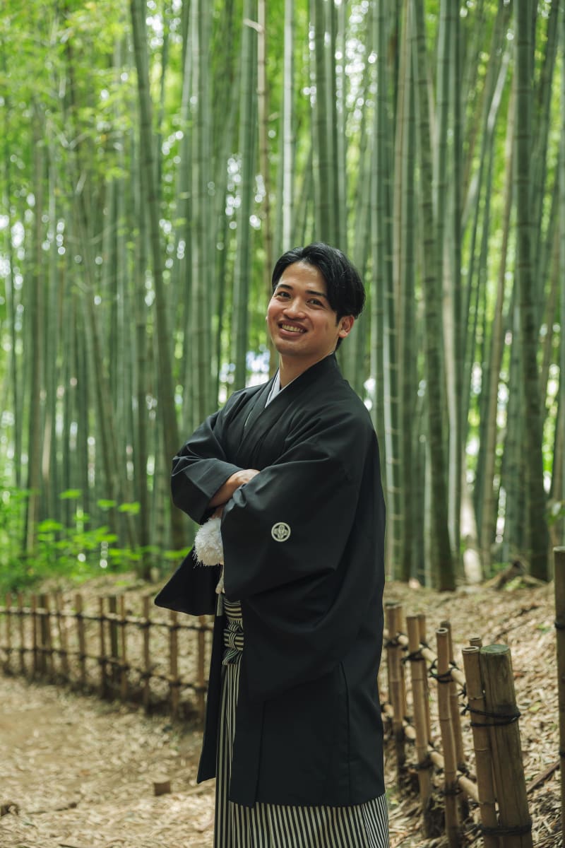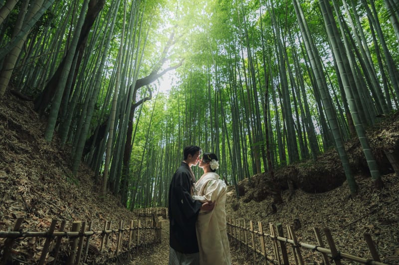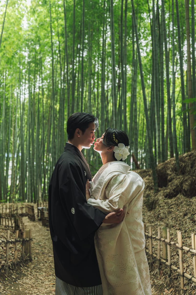 竹林の爽やかな緑に囲まれながら撮影しました。緑の中では赤や白がとてもよく映えます!