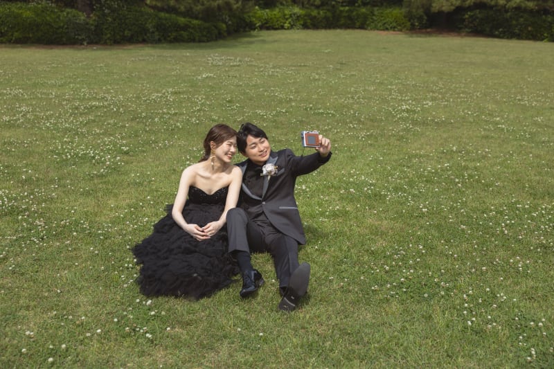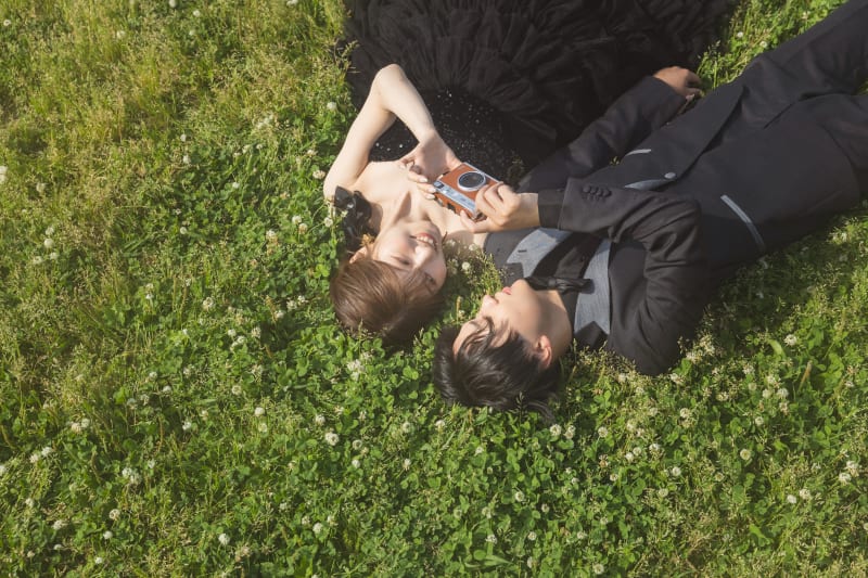ラストはおふたりが寝転んで芝生一面とお二人の見つめ合いショット!