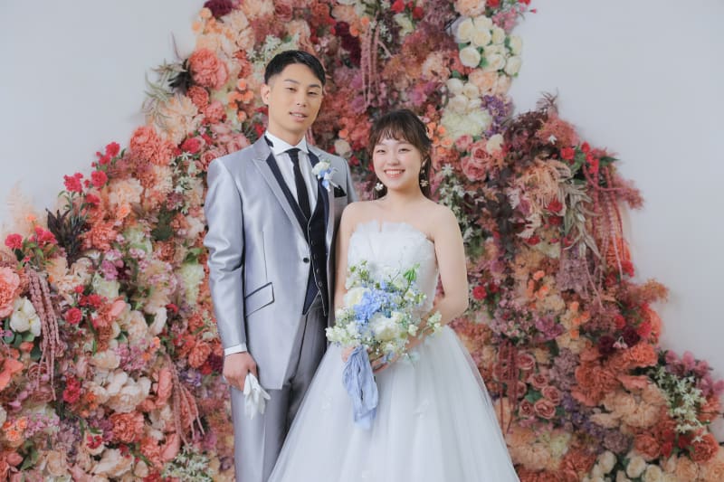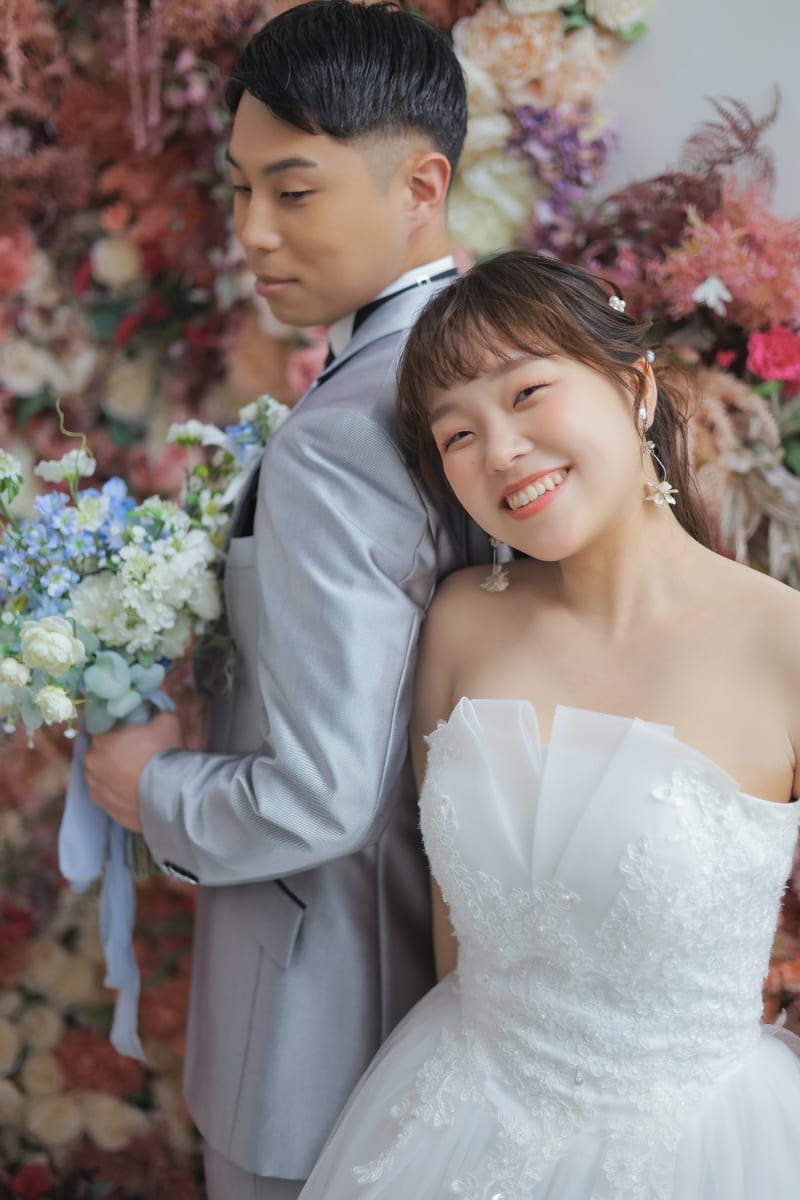 こちらもフラワーウォルの前で!ご新婦様の笑顔が素敵ですね。