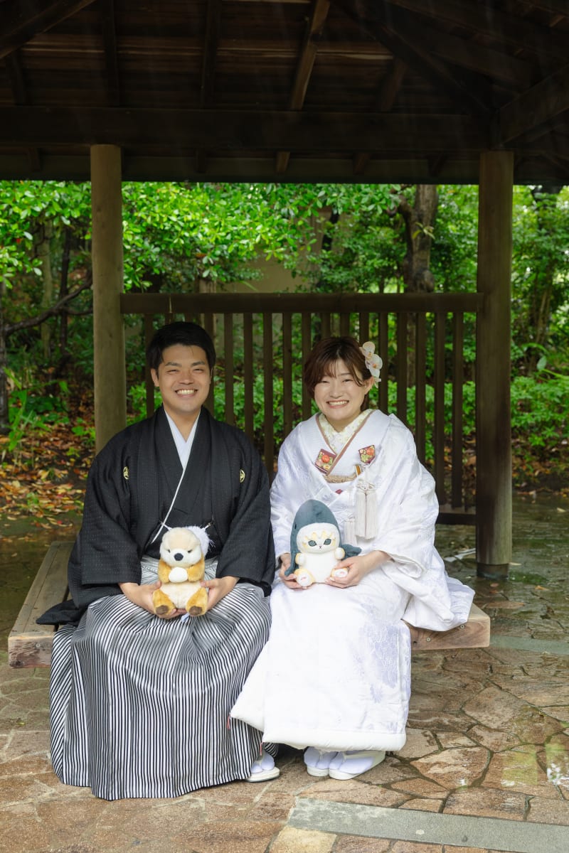 屋根の下で雨宿りしながら。お二人の好きなぬいぐるみをお持ちいただきました!可愛らしい笑顔が見られました♪