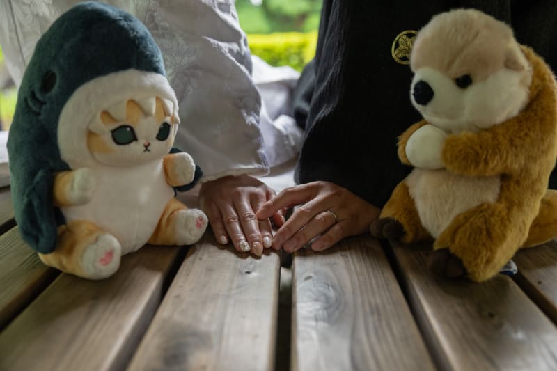 お互いのおでこをくっつけて。ぬいぐるみたちがお二人のことを見守っています。